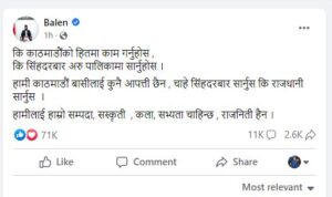 उनले सामाजिक सन्जालमा लेखेका छन्, ‘कि काठमाडौंको हितमा काम गर्नुहोस्, कि सिंहदरबार अरु पालिकामा सार्नुहोस् । हामी काठमाडौंवासीलाई कुनै आपत्ति छैन, चाहे सिंहदरबार सार्नुस् कि राजधानी सार्नुस् ।’